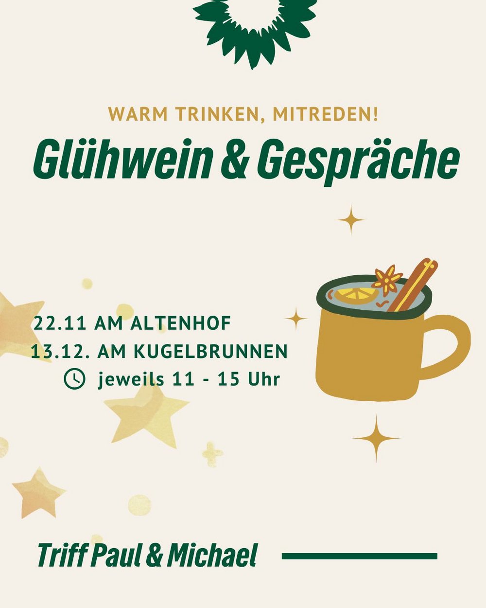 Bei einer Tasse Glühwein oder einem alkoholfreien Heißgetränk möchten wir mit euch ins Gespräch kommen – über das, was euch bewegt, und über das, was uns antreibt: Klimaschutz, soziale Gerechtigkeit und Vielfalt.