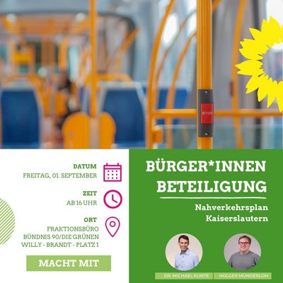 Die Stadtratsfraktion möchte dadurch die momentan laufende Bürger*innenbeteiligung der Stadt unterstützen. Bis zum 08. September besteht die Möglichkeit, Anregungen und Anfragen bzgl. des Nahverkehrsplans an das Referat Stadtentwicklung zu richten (nahverkehrsplan@kaiserslautern.de). Die Grüne Bürger*innensprechstunde soll es Interessierten ermöglichen, das Konzept vor Ort kennenzulernen und gemeinsam Ideen zu sammeln.