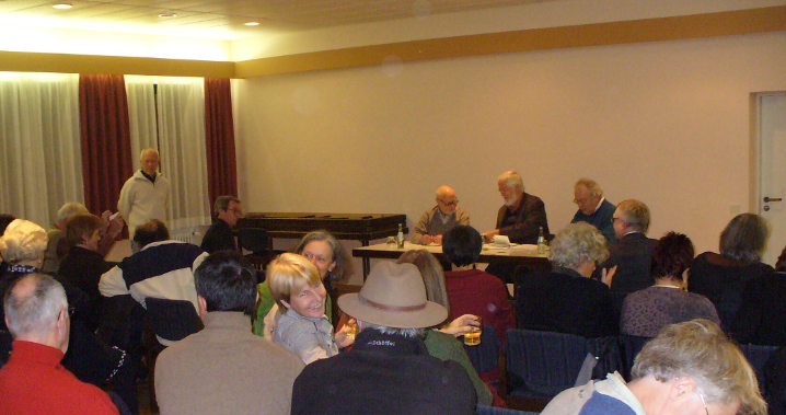 Abrüstung, Konversion und zivile Konfliktbearbeitung seien, sobald sie hinreichend entwickelt seien, die Instrumente, mit denen der Ausstieg aus Rüstung und Militär bewältigt werden könne. Im übrigen setzt er auf die Verpolizeilichung des Militärischen weltweit. An die Stelle der Vernichtung des Gegners oder Störers tritt dabei die Sanktion unter strenger Beachtung der Verhältnismäßigkeit der Mittel. Für all das lohne es sich, nach besten Kräften zu streiten, auch für Leute “in der Endspielzeit ihres Lebens“, fügte der 71-jährige Zeitzeuge hinzu. Der Widerstand der GRÜNEN von Kaiserslautern Stadt und Land sowie der „Bürgerinitiative gegen Fluglärm“ gegen unverantwortliche Militärprojekte seien für ihn eine starke Ermutigung, so Vogt nach lebhafter Diskussion mit den rund 40 Gästen des Zeitzeugengesprächs.