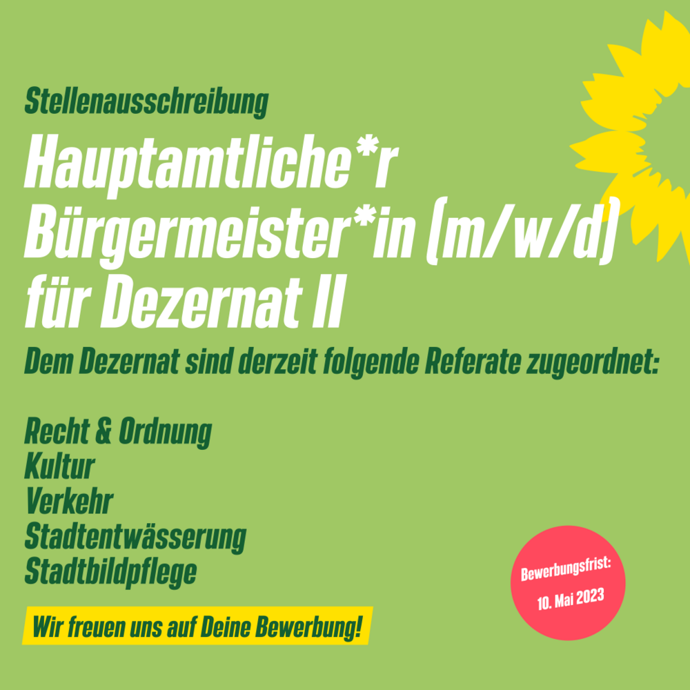 neu zu besetzen. Dem Dezernat sind derzeit die Referate Recht und Ordnung, Kultur, Verkehr, die Stadtentwässerung sowie die Stadtbildpflege Kaiserslautern zugeordnet. Ein Vorschlagsrecht zur Änderung der Zuordnung obliegt gemäß Gemeindeordnung dem Oberbürgermeister. Die Partei und Fraktion von Bündnis 90/Die Grünen möchte zur Wahl im Stadtrat eine/n geeignete/n Kandidat*in aufstellen.