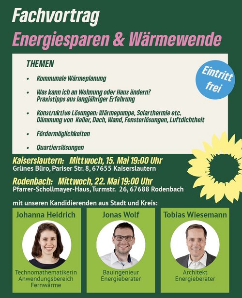 Herzliche Einladung zum Fachvortrag Energiesparen und Wärmewende . Mit dabei unsere Kandidierenden für Stadt und Kreis: Johanna Heidrich, Jonas Wolf und Tobias Wiesemann. Zu Gast sein wird außerdem Paul Ngahan (Mitglied der GRÜNEN in Bad Kreuznach), der als Fachingenieur für Energieeffizienz und Experte für nachhaltige Wärmeversorgung ebenfalls seine Expertise miteinbringen wird. Im Anschluss freuen wir uns mit euch bei einem kühlen Getränk ins Gespräch zu kommen!