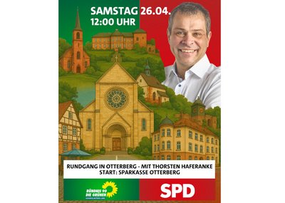 Am Samstag, den 26.04.25, um 12 Uhr, startet auf dem Johann-Casimir-Platz bei der Sparkasse in Otterberg ein Stadtrundgang mit dem SPD-Landratskandidaten Thorsten Haferanke. Zum diesem Rundgang laden SPD und Grüne ein.