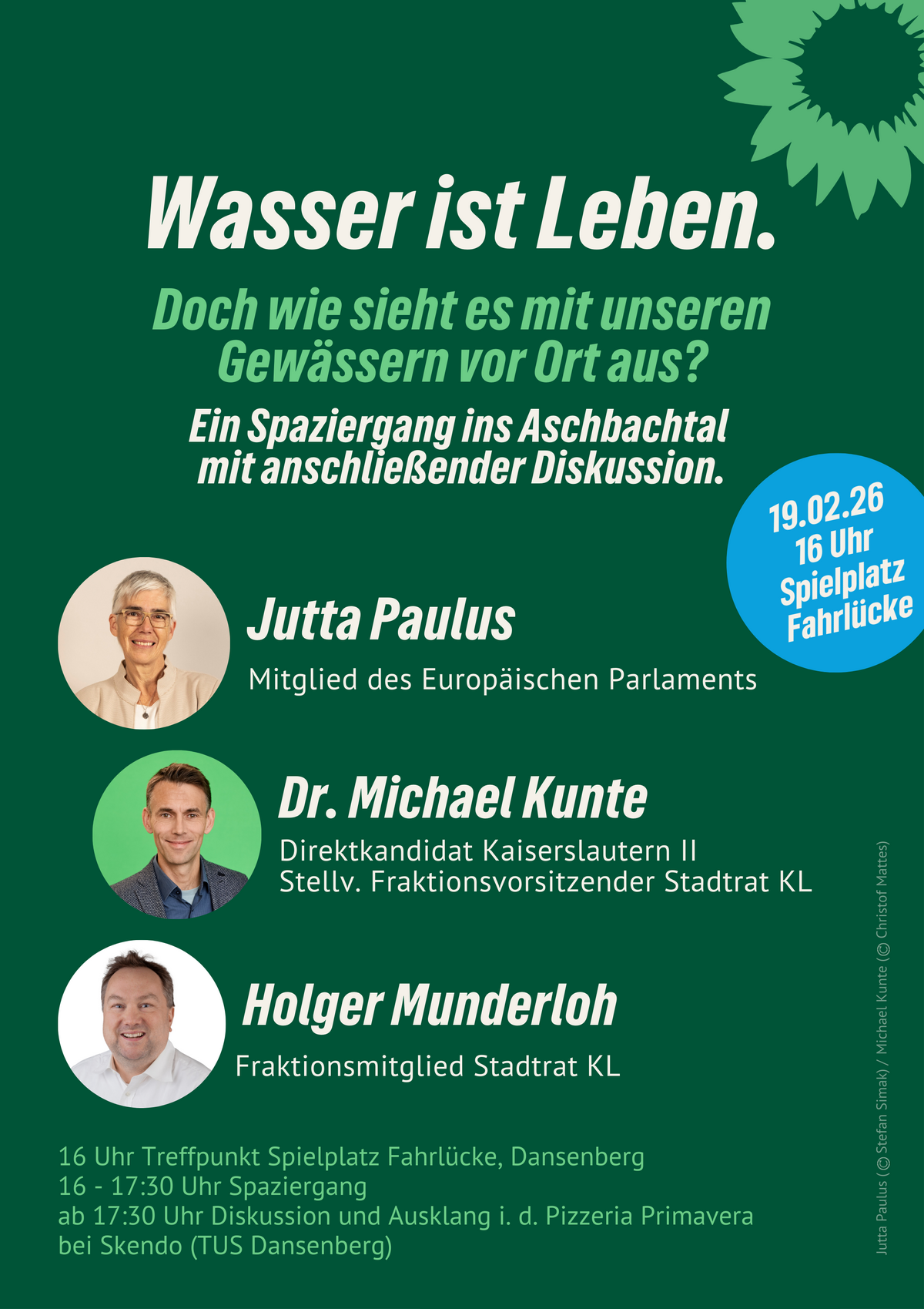 Mit dabei sind Jutta Paulus (Mitglied des Europäischen Parlaments), Dr. Michael Kunte (Direktkandidat Kaiserslautern II) sowie Holger Munderloh (Fraktionsmitglied im Stadtrat Kaiserslautern).